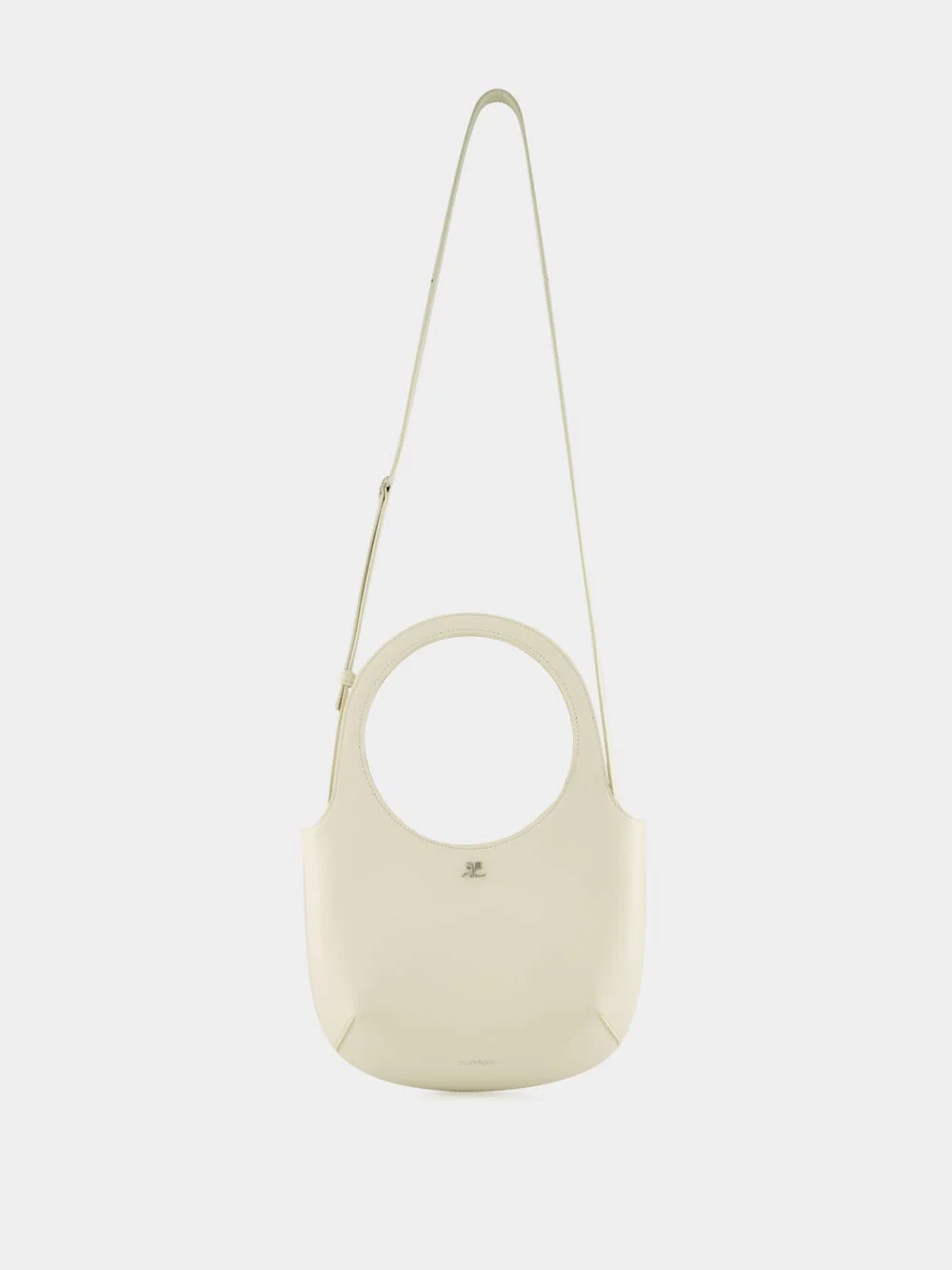 The Holy bag in smooth off-white calf leather embodies Courrèges' modern elegance. Its sculptural silhouette features a magnetic closure, metallic AC logo, and buckle-detailed handles. A removable and adjustable shoulder strap with clasps adds versatility, while the discreet embossed logo and interior pocket enhance functionality. Crafted in Italy, it's a sophisticated statement for contemporary day-to-evening styling.