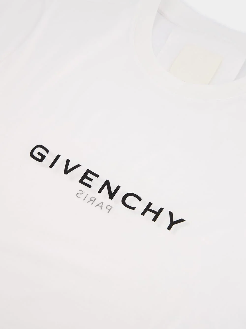 This short-sleeved cotton tee features a classic crew neck, offering timeless comfort and style. Highlighting the iconic GIVENCHY Paris signature in a reverse-effect print on both front and back, this tee is a unique fashion statement. Complete with a subtle 4G emblem on the lower back, its slim fit design ensures a sleek, modern look.