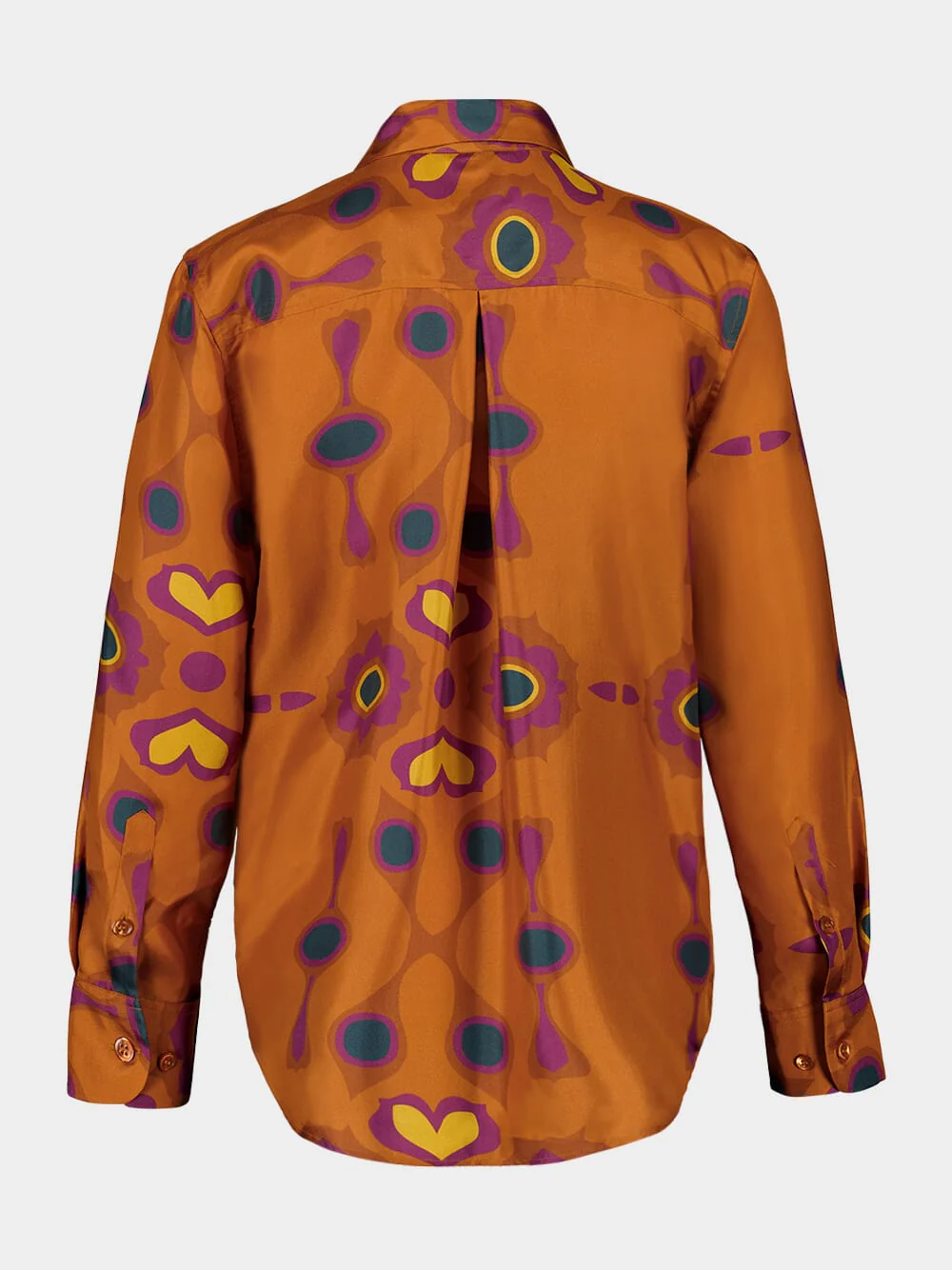 The Ametista Hawaii Flower Printed Silk Twill Shirt combines luxury with bold style, featuring an eye-catching geometric pattern in warm shades of burnt orange, purple, and green. Crafted from 100% silk twill, this shirt offers a refined yet artistic look, perfect for elevating both casual and formal spring and summer outfits. Made in Portugal.