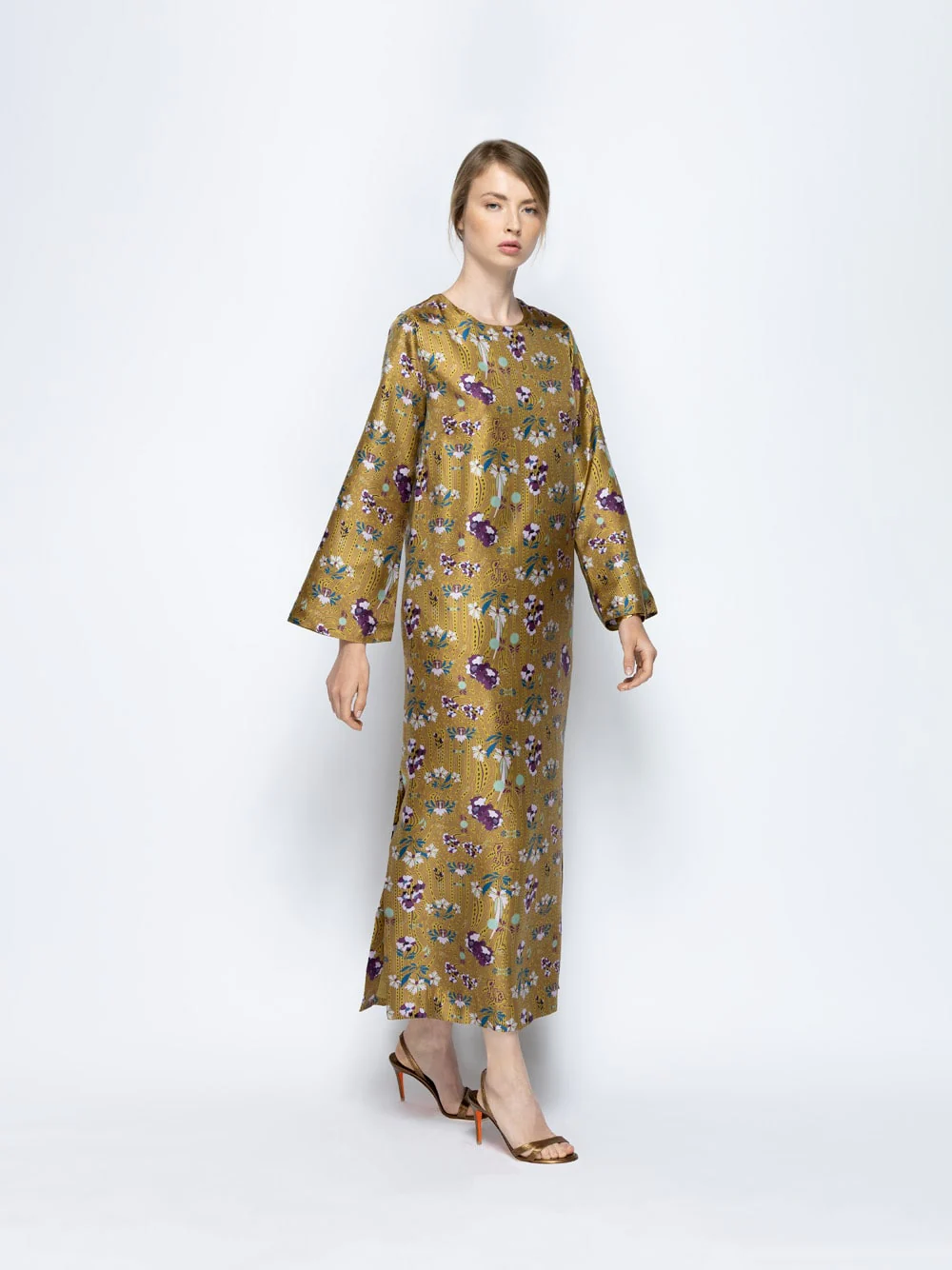 A bold celebration of print and silhouette, the Shirley Floral Psic Printed Silk Twill A-Line Dress captures the spirit of modern femininity. Cut from 100% silk twill, it flows in a full-length A-line shape, enhanced by wide sleeves and a clean neckline. The mustard yellow base is brought to life with vibrant floral motifs in violet, green, and blue—delivering drama with effortless grace. Made in Portugal.